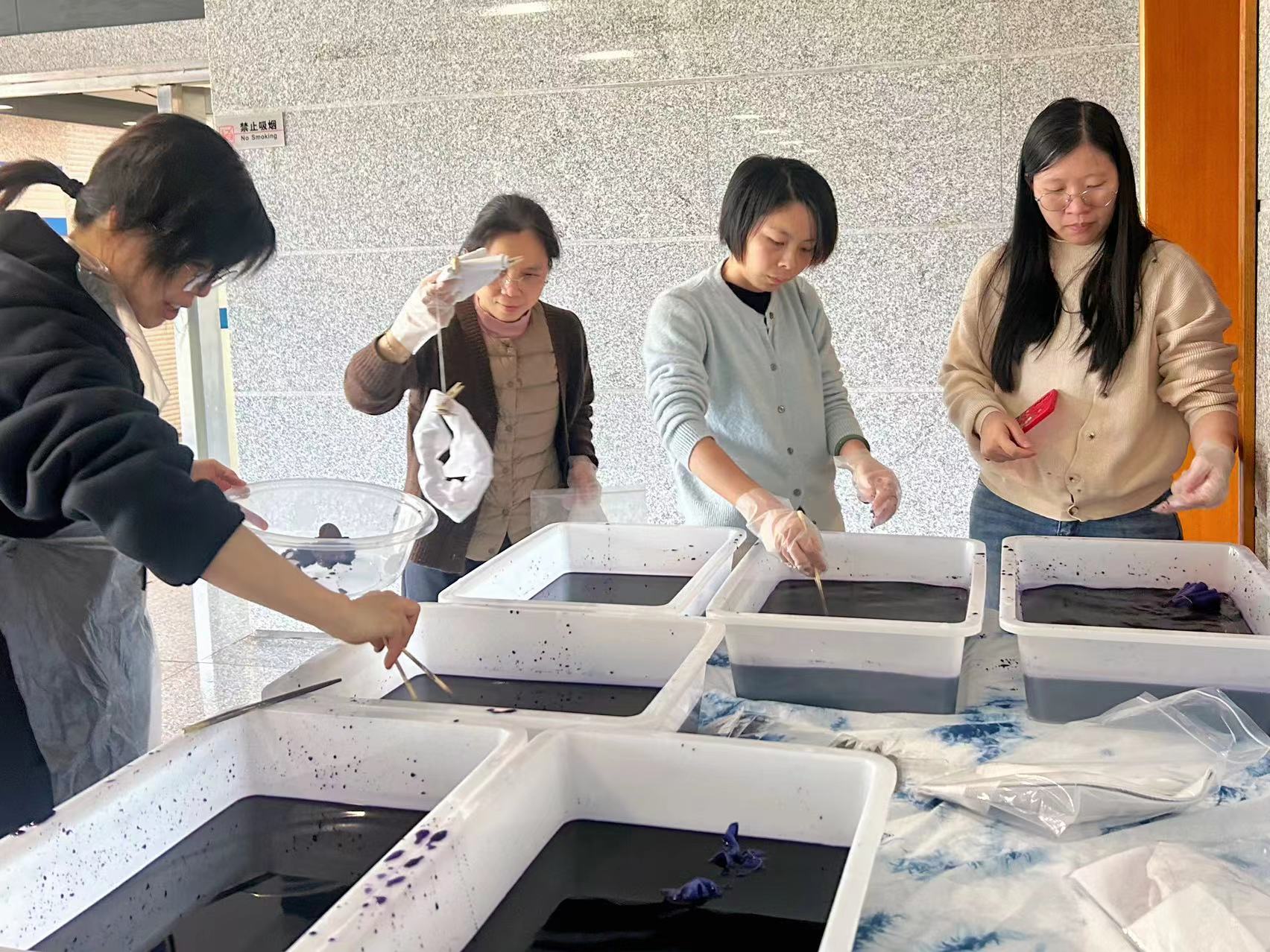“巧手扎錦繡,靛藍染繁花”,扎染活動進入正題,大家先對扎染的歷史淵源、發(fā)展脈絡、制造技藝有了深入了解,并通過一系列風格迥異的扎染藝術作品,激發(fā)了濃厚的創(chuàng)作熱情。隨后,大家通過夾扎法和捆扎法,發(fā)揮想象力和創(chuàng)造力,親自設計、結扎并染色,制作出獨具特色的扎染作品。