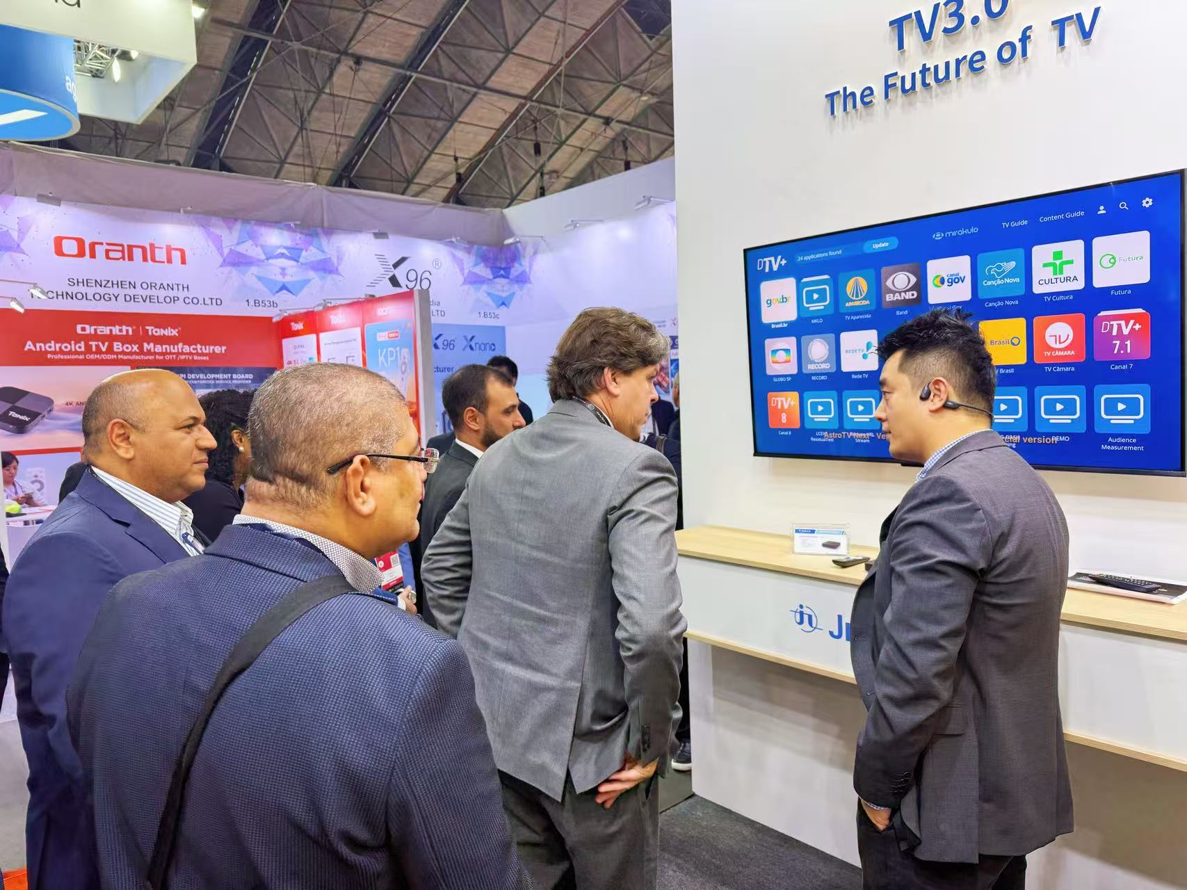 與此同時(shí),最新研發(fā)的巴西下一代數(shù)字電視標(biāo)準(zhǔn)TV 3.0機(jī)頂盒引發(fā)高度關(guān)注 — 巴西通信部部長Frederico de Siqueira Filho駐足九洲展位,認(rèn)真聆聽海外銷售團(tuán)隊(duì)對(duì)該產(chǎn)品的講解。該產(chǎn)品憑借 “多標(biāo)準(zhǔn)兼容 + 超高清體驗(yàn) + 場(chǎng)景適配” 的核心優(yōu)勢(shì)脫穎而出:一方面解決了不同區(qū)域信號(hào)接收的適配難題;另一方面搭載 Andriod 4K 系統(tǒng),以超高清音畫技術(shù)精準(zhǔn)還原細(xì)膩光影細(xì)節(jié)與立體聲音效,再結(jié)合多元內(nèi)容池的資源支撐,可靈活滿足家庭集體觀影、個(gè)人碎片化追劇等多樣化需求,成為本次展會(huì)中體現(xiàn) “技術(shù)適配性 + 用戶體驗(yàn)感” 的代表性產(chǎn)品。